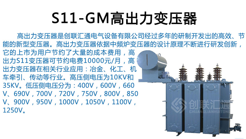 S11-GM高出力變壓器適用于冶煉廠、特別是鑄造廠、大型用電企業(yè)等,為用戶節(jié)省大量的固定電費,經(jīng)濟效益顯著。